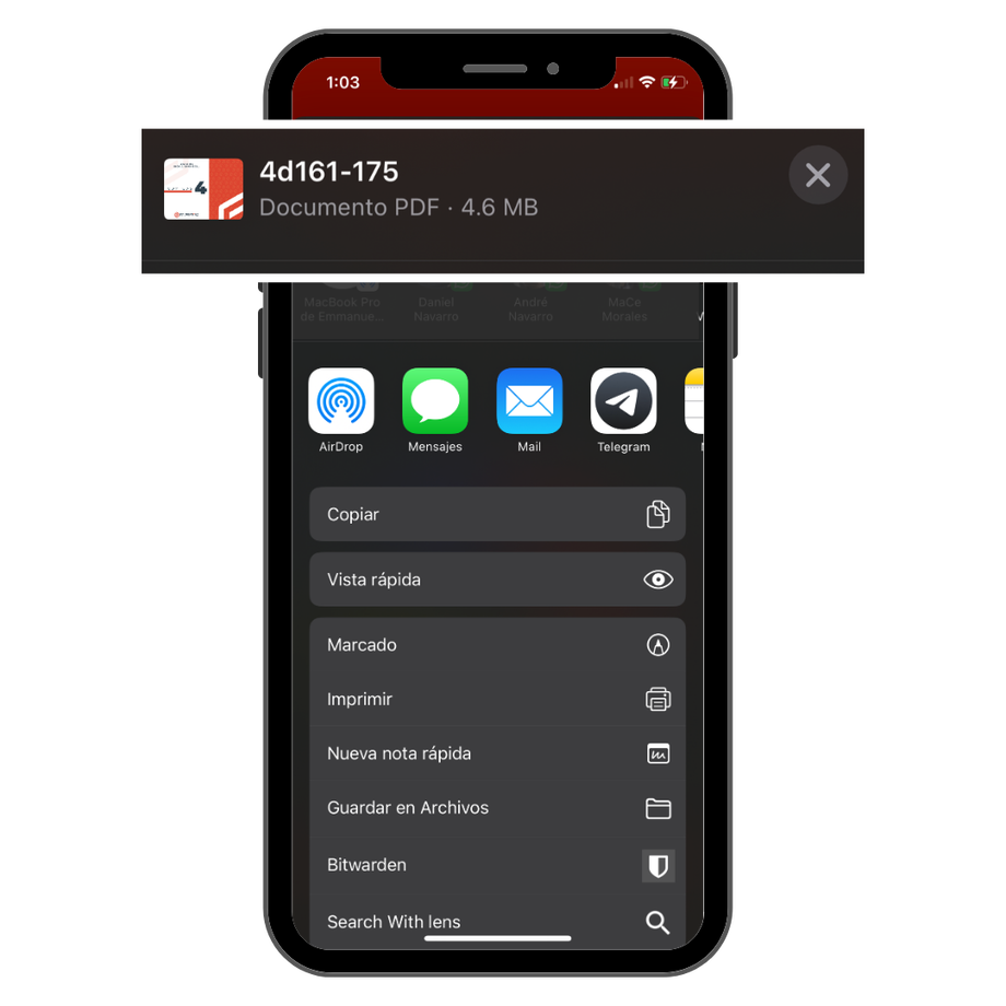 4. Para usuarios de iPhone: Tras esperar unos segundos, aparecerá un cuadro de diálogo en la parte inferior de tu pantalla. Este cuadro te permitirá seleccionar el destino de tu archivo PDF. Tienes diversas opciones a tu disposición, como enviarlo por correo electrónico, compartirlo a través de WhatsApp, guardarlo en tus archivos, entre otras. Para completar el proceso, elige la opción que prefieras y, posteriormente, podrás acceder y visualizar tu PDF en el lugar seleccionado.