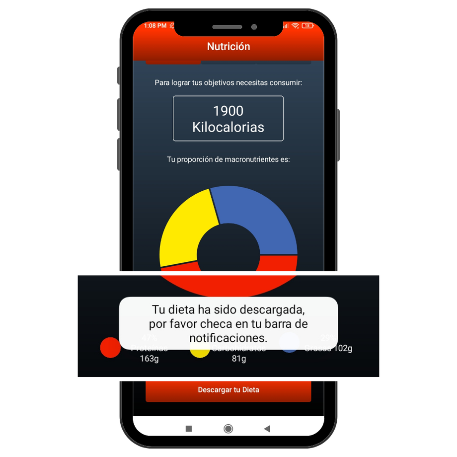 5. Para usuarios de Android: Al presionar el botón de descarga, recibirás una notificación en pantalla indicando: Tu dieta ha sido descargada, por favor checa en tu bandeja de notificaciones.