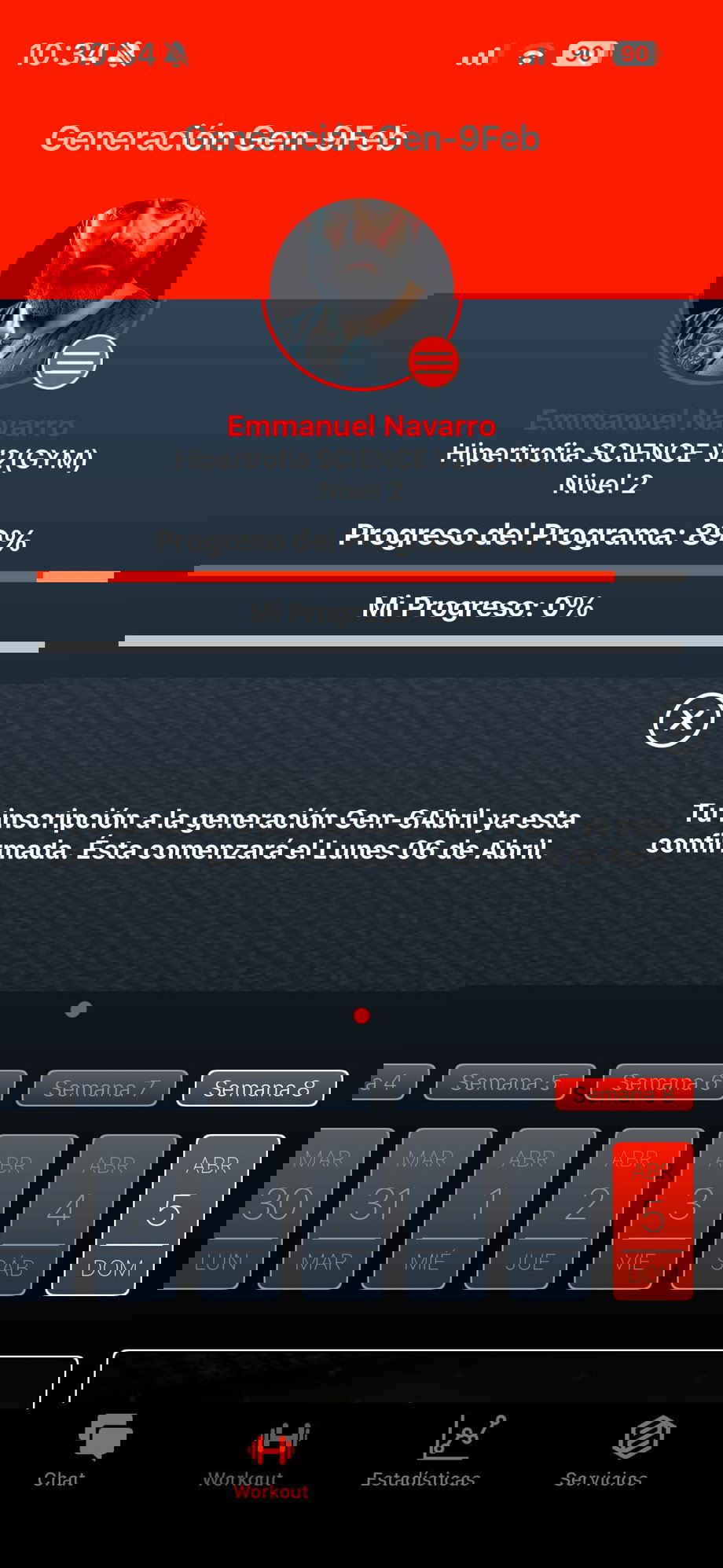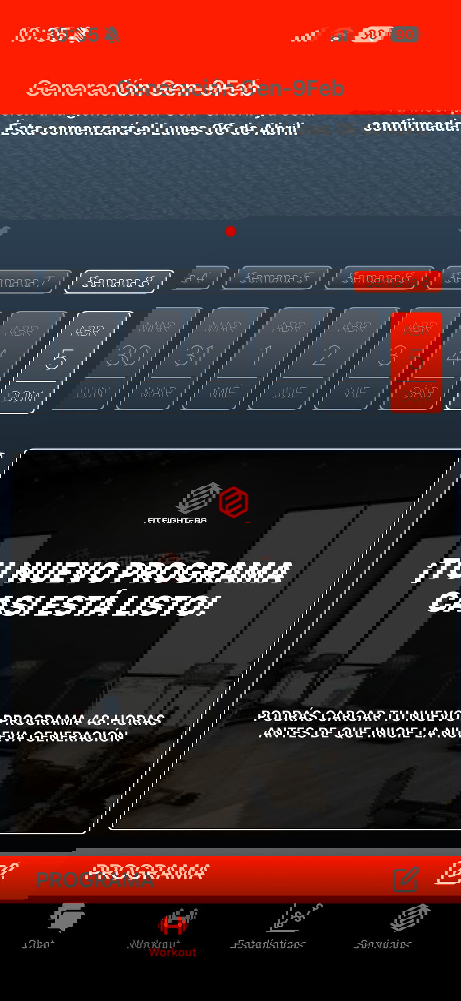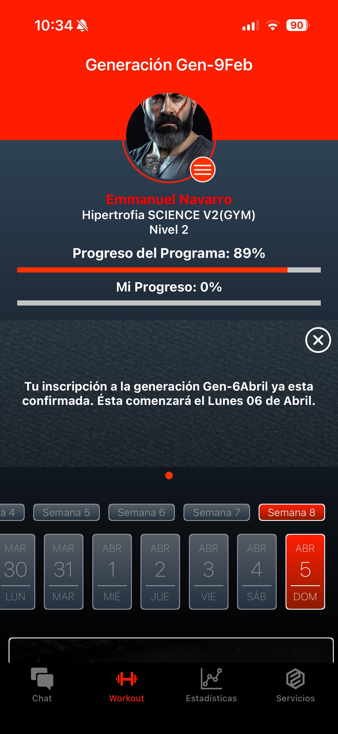 Una vez que verifiques que ya estás dado de alta en la nueva generación, dentro de esa misma sección de Workouts, dirígete a las tarjetas donde están tus rutinas y deslízate hasta la última tarjeta del lado derecho (semana 8 si vienes de un plan de paga, o semana 4 si vienes de un plan free).