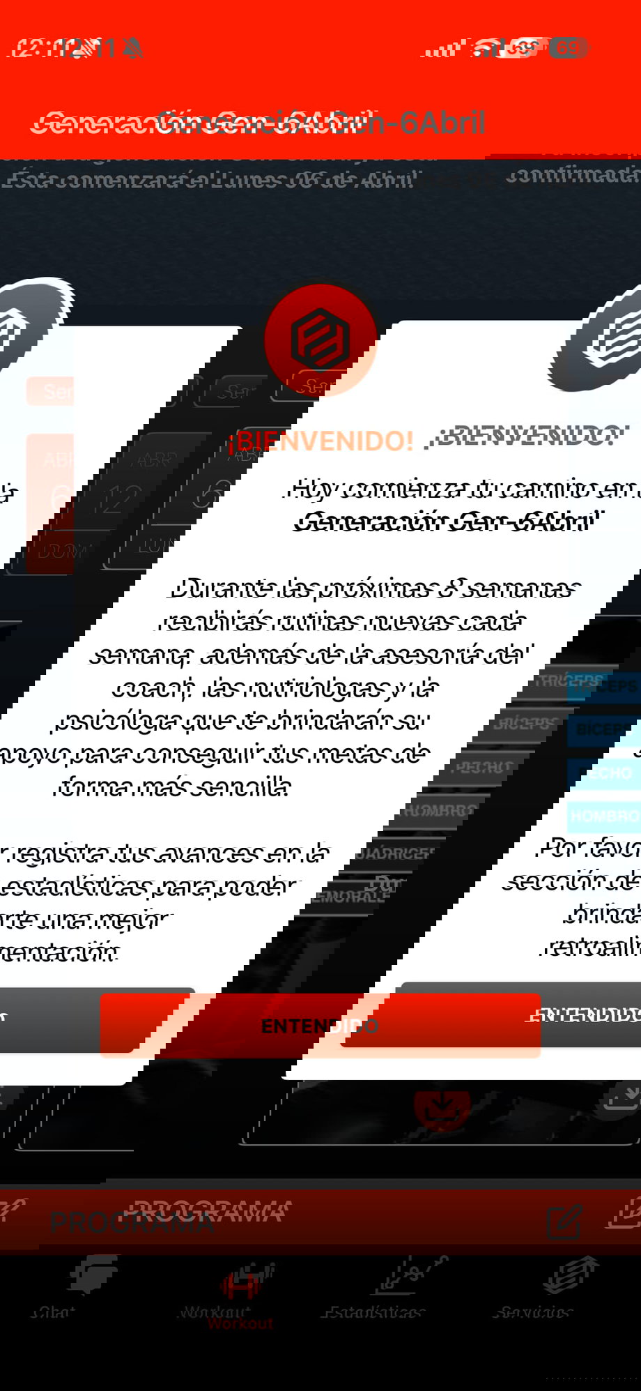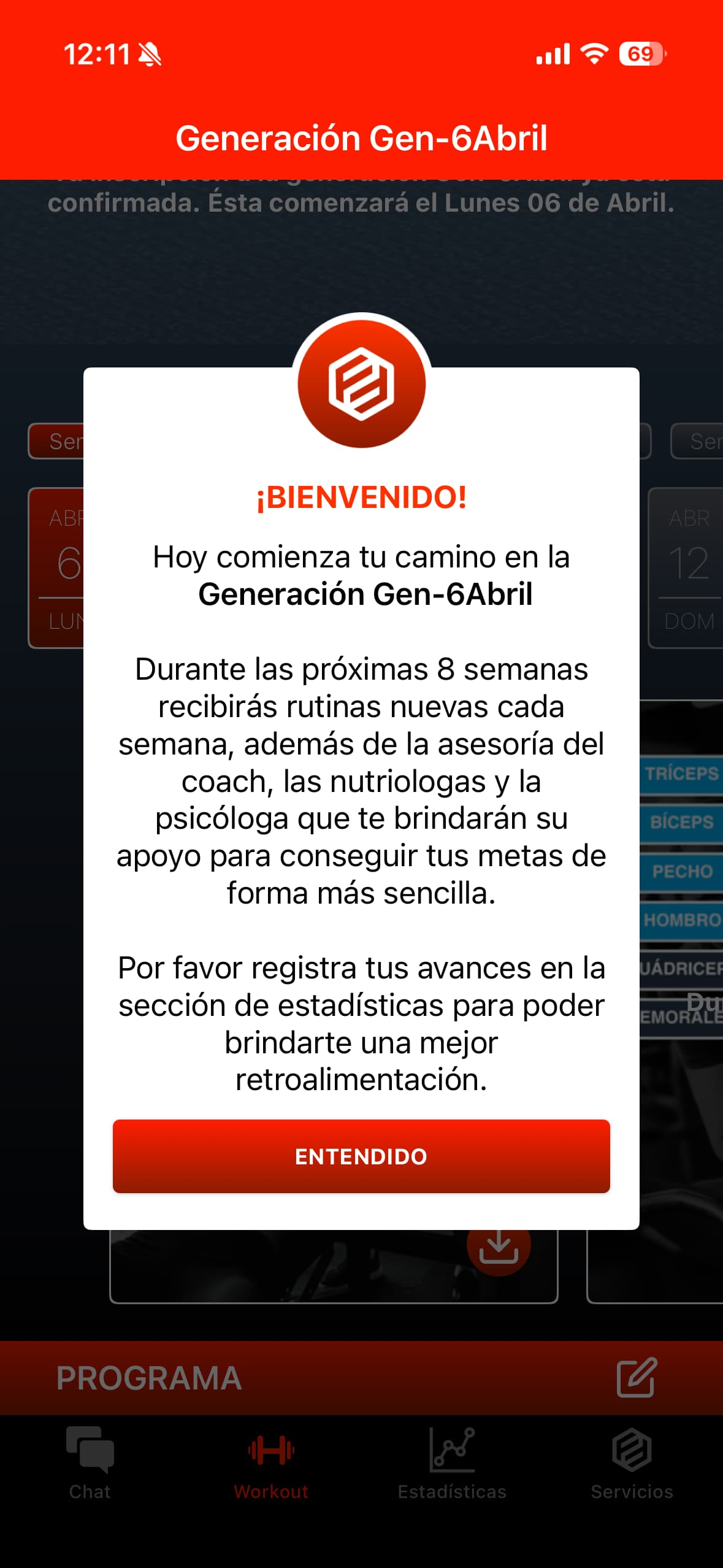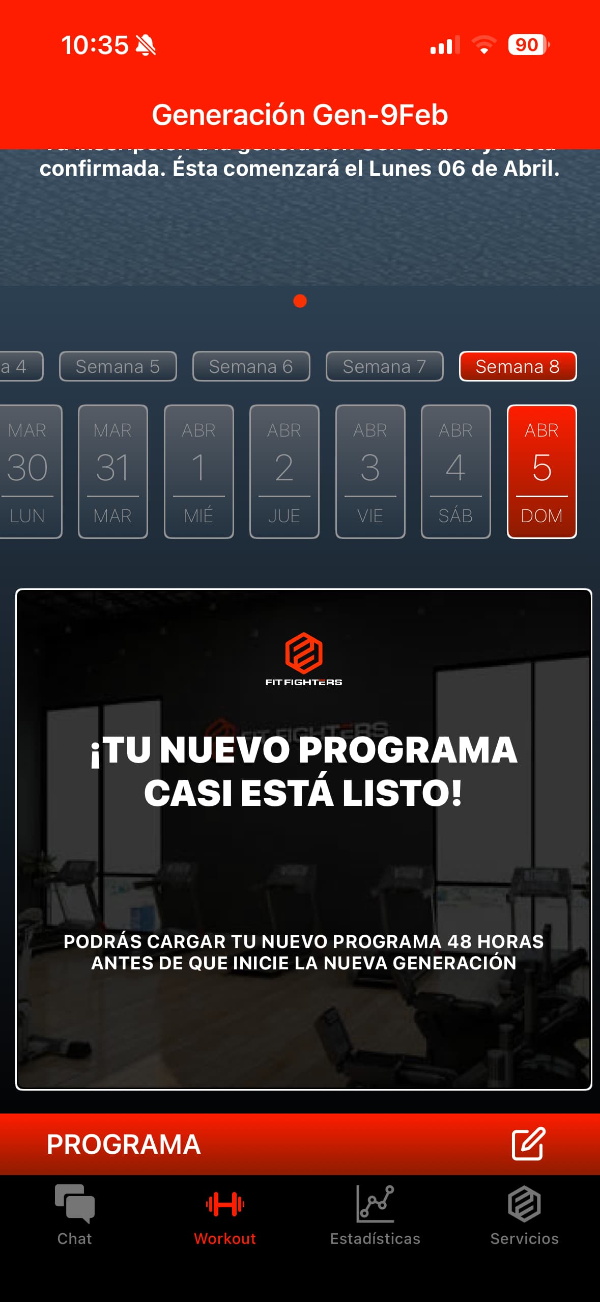 Una vez que verifiques que ya estás dado de alta en la nueva generación, dentro de esa misma sección de Workouts, dirígete a las tarjetas donde están tus rutinas y deslízate hasta la última tarjeta del lado derecho (semana 8 si vienes de un plan de paga, o semana 4 si vienes de un plan free).